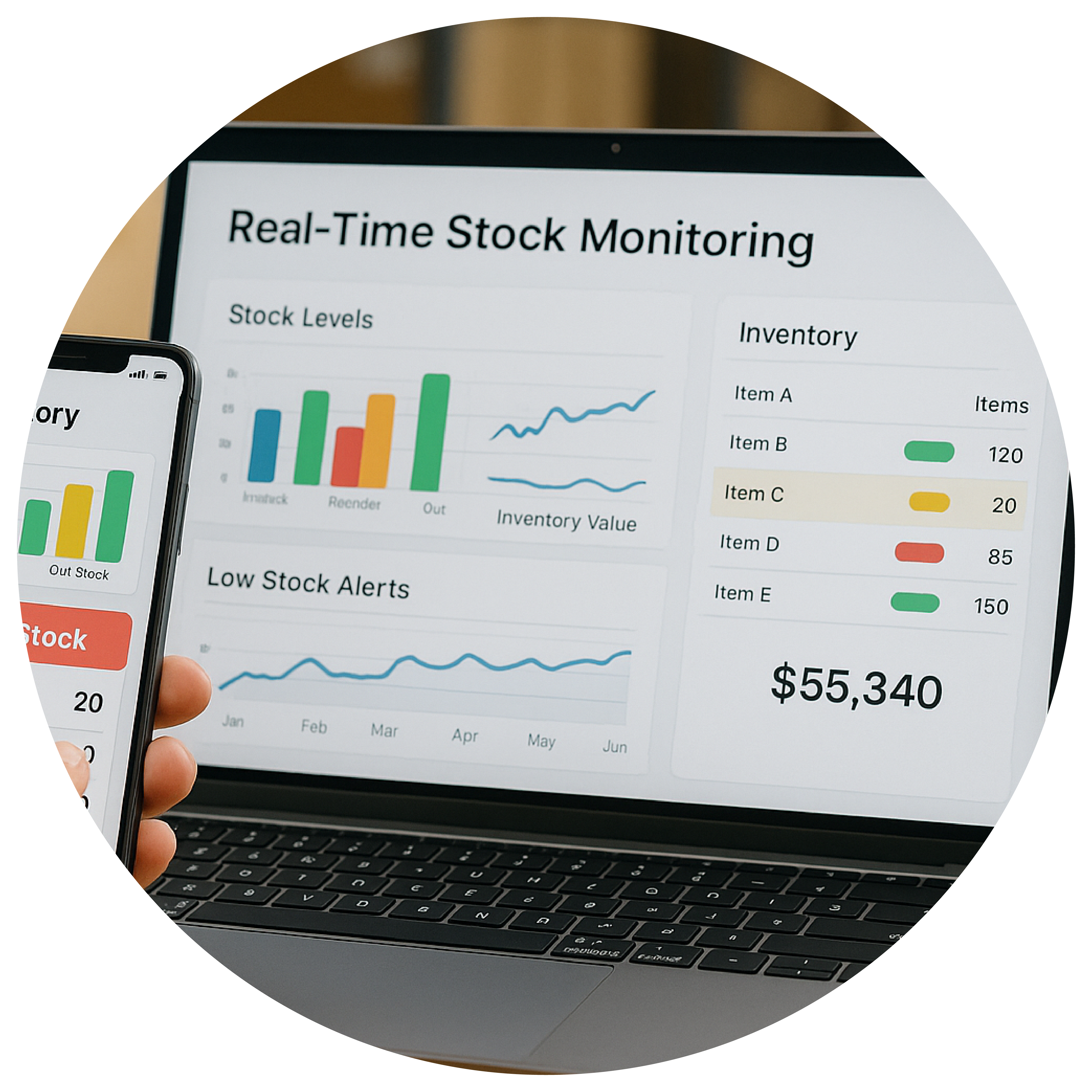 Real-time stock monitoring tools that help customers maintain optimal inventory levels and make informed purchasing decisions.