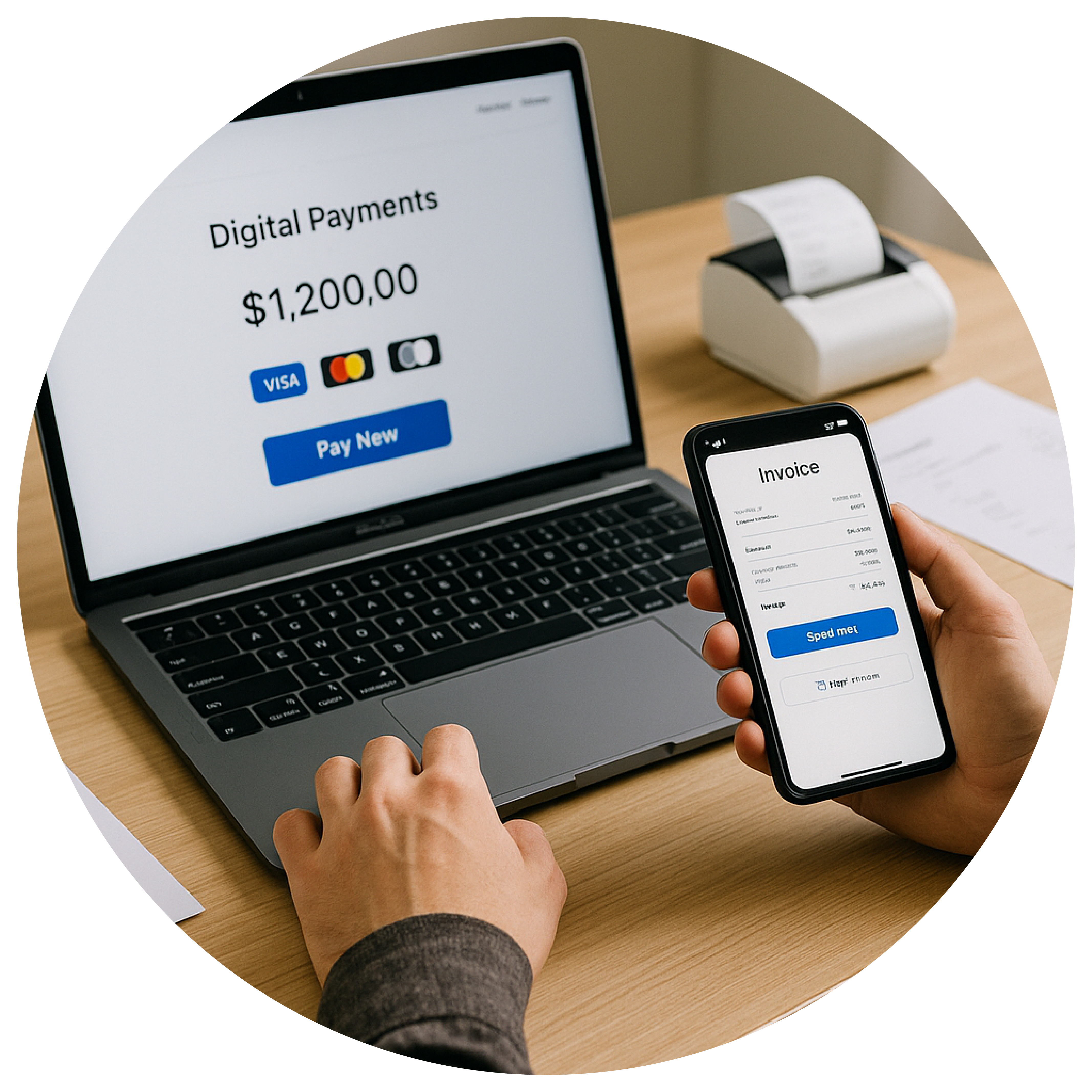 An integrated module for seamless digital payments and automated invoice generation to simplify transaction processing.